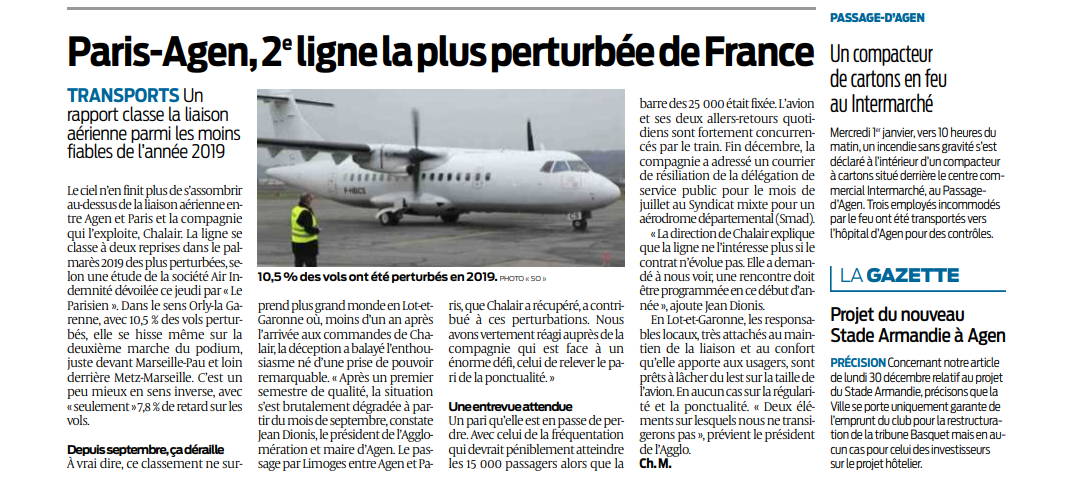 Janvier 2020 : Le Petit Bleu d'Agen : Agen / Paris, la liaison aérienne qui reste à la traîne